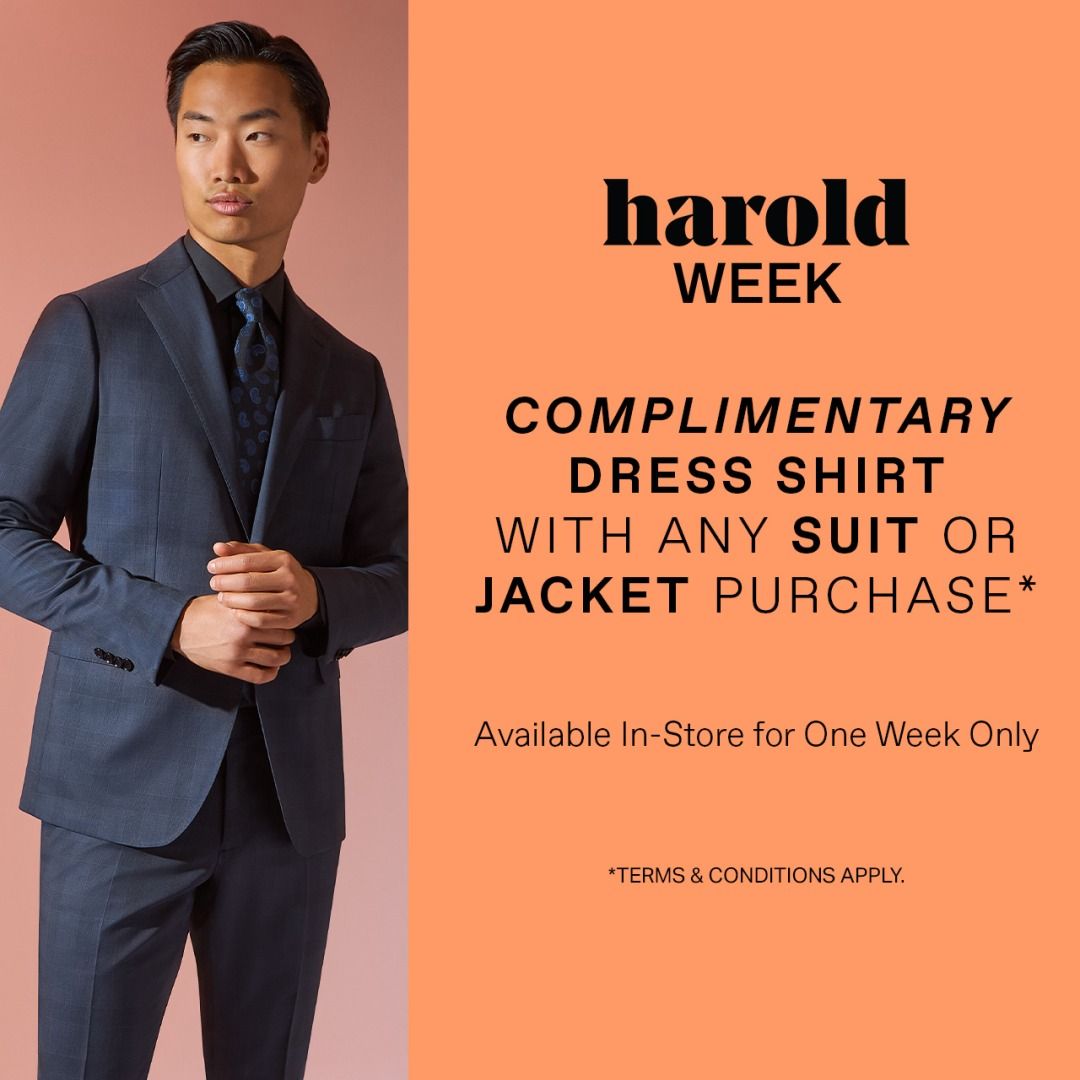 Fri, 24 Oct 2025 - Sun, 2 Nov 2025Complimentary Dress Shirt with Any Suit or Jacket Purchase. Available In-Store for One Week Only *Terms & Conditions apply.