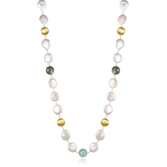 12-13mm White Freshwater Pearls, Labradorite and Aqua Chalcedony Necklace