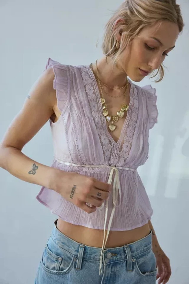 Kimchi Blue Amelie Eyelet Lace Trim Tie-Front Babydoll Top