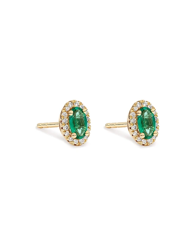 Oval Cut Green Emerald Gemstone and 0.09 Carat TW Diamond Halo Stud Earrings in 10kt Yellow Gold
