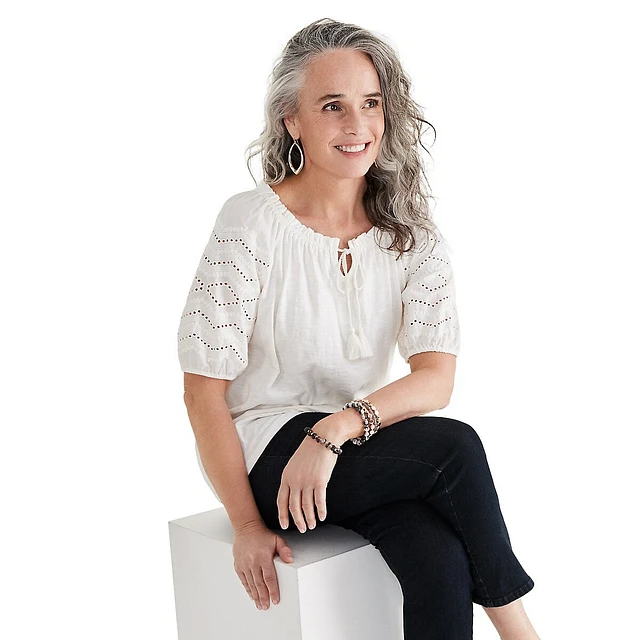 Short Eyelet Sleeve Top & Embroidered Jeans
