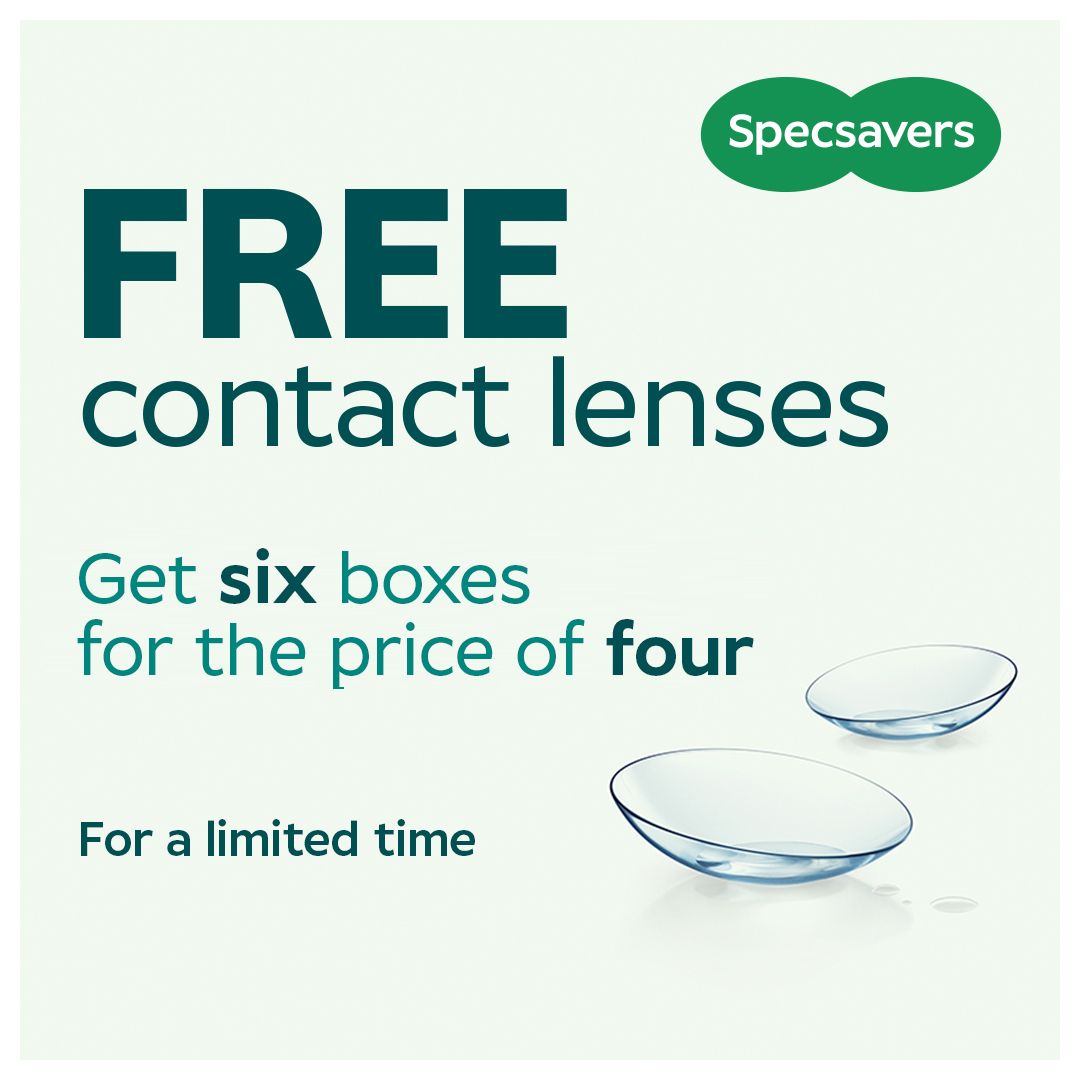 Sat, 6 Dec 2025 - Sun, 21 Dec 2025For a limited time, when you buy four boxes of contact lenses at Specsavers, we’ll give you two extra boxes, free. Whether you’ve never tried contact lenses before, wear them every day, or just once in a while, now’s a pretty good time to stock up. Head over to your local store soon to get topped up – prescriptions from any optometrist welcome (we don’t mind where it’s from). Terms and conditions apply.FREE contact lenses For a limited time, get six boxes for the price of four