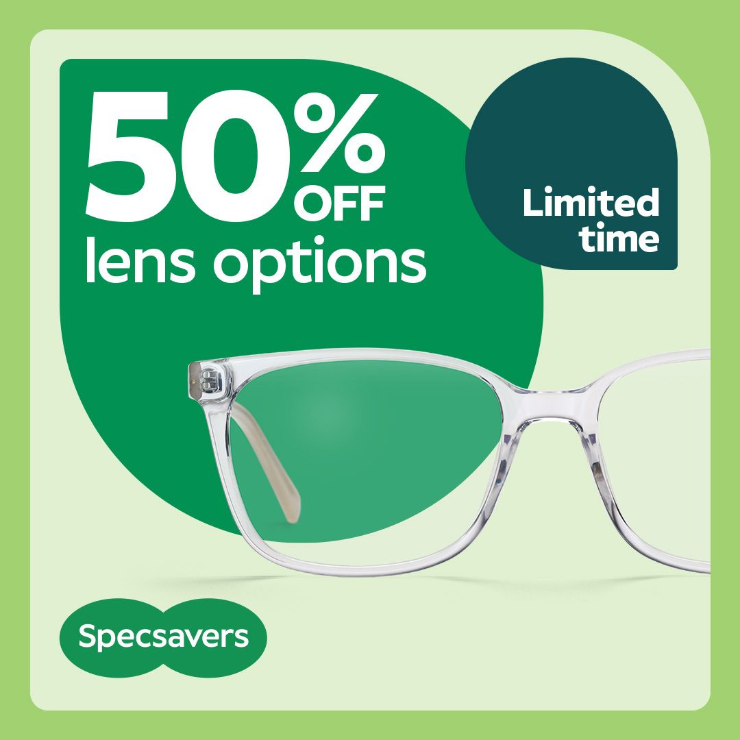 Wed, 25 Mar 2026 - Sat, 2 May 2026For a limited time, you can customize your lenses for less with 50% off lens options. Whenever you buy glasses from us, we always include standard single-vision lenses with a scratch-resistant treatment and UV protection. But there’s a whole range to choose from — now for 50% off — to help tailor your glasses to your lifestyle, including: UltraClear SuperClean lenses: good for cutting down on annoying glare and reflections, as well as making sure your lenses stay cleaner for longer. Sun protection lenses: perfect for sunny days, even in winter – go for polarized lenses to ditch the glare from water and snow or Reactions that cleverly adapt to light conditions. Thin + Light lenses: a great choice for higher prescriptions, as they improve the comfort and look of your frames. And to make it even better, this deal can be combined with our two pairs for $149 offer or with 2 pairs of kids' glasses starting at $99. Prefer a frame-free look sometimes? Not a problem — with us, you can get contact lenses for under $1 a day with Specsavers easyvision Elision dailies. So why wait? Head to your local store soon to take advantage of this limited-time sale. Terms and conditions apply.50% off lens options For a limited time