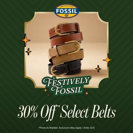 Mon, 15 Dec 2025 - Sun, 21 Dec 2025For a limited time enjoy 30% off well-crafted belts that tie every look together. Show now at Fossil. *Prices As Marked. Exclusions May Apply. I Ends 12/21