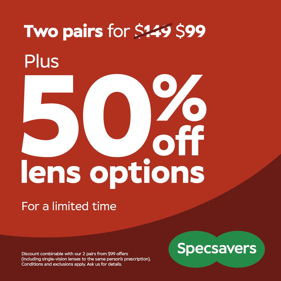 Wed, 11 Feb 2026 - Tue, 17 Feb 2026For a limited time, get two pairs for just $99, plus 50% off lens options and create your perfect pairs, for less. There’s a whole range to choose from to help tailor your glasses to your lifestyle, including: UltraClear SuperClean lenses: good for cutting down on annoying glare and reflections, as well as making sure your lenses stay cleaner for longer. Sun protection: Perfect for sunny days, even in winter — go for polarized lenses to ditch the glare from water and snow or Reactions that cleverly adapt to light conditions. Thin + Light lenses: a great choice for higher prescriptions, as they improve the comfort and look of your frames Don’t wait — head to your local store soon to take advantage of this limited-time sale, which ends on Tuesday, February 17. Terms and conditions apply. Prescriptions from any optometrist welcome Just bring in your prescription to the nearest store and we’ll help you find new frames. Otherwise, if you haven’t had an eye exam recently (in the last two years), then it’s best to book one now.Two pairs for $99 Plus, for a limited time, get 50% off lens options